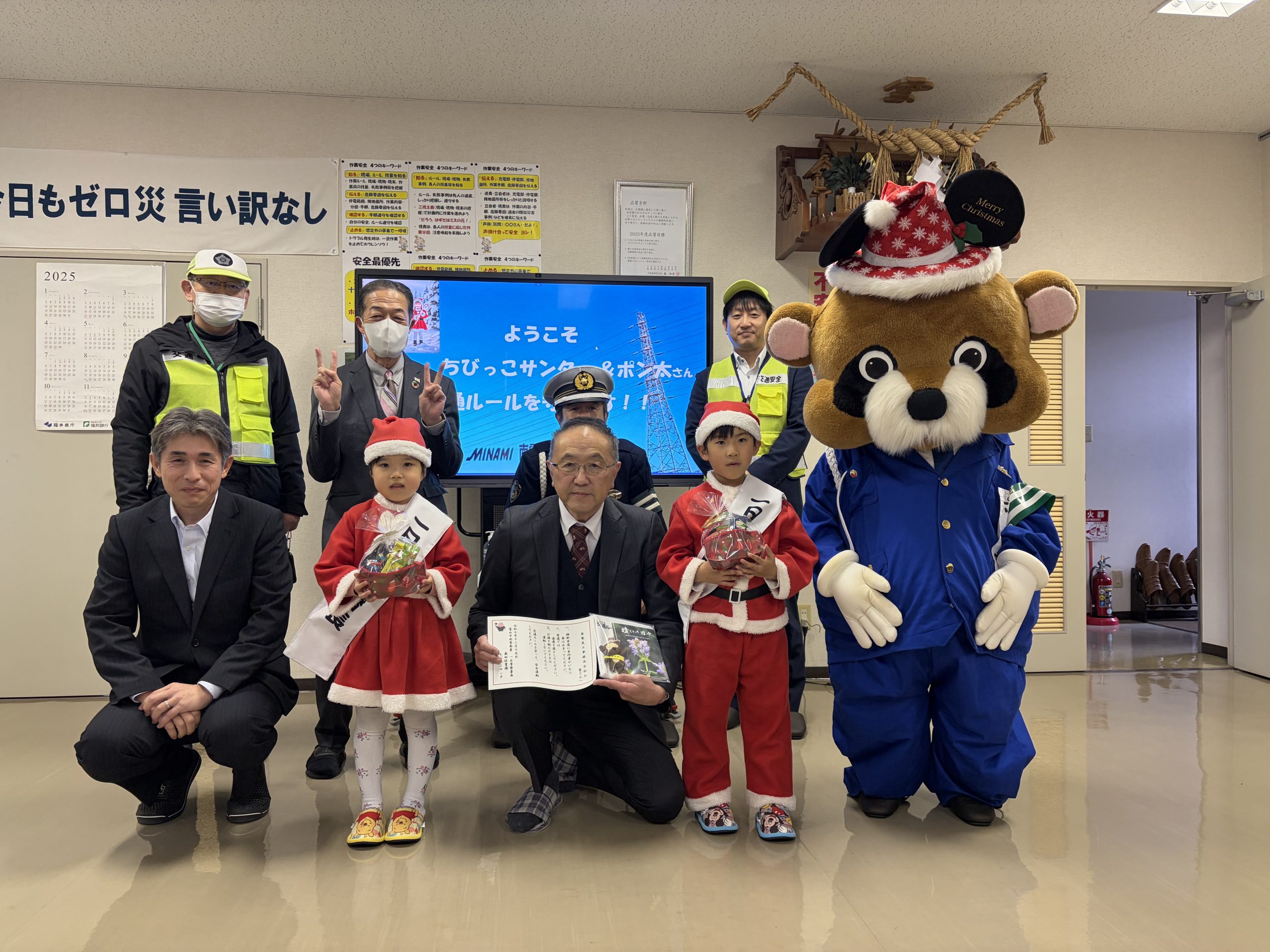 「ちびっこサンタ」さんと「タヌキの交通指導員ポン太」さん、ご来社ありがとうございました。